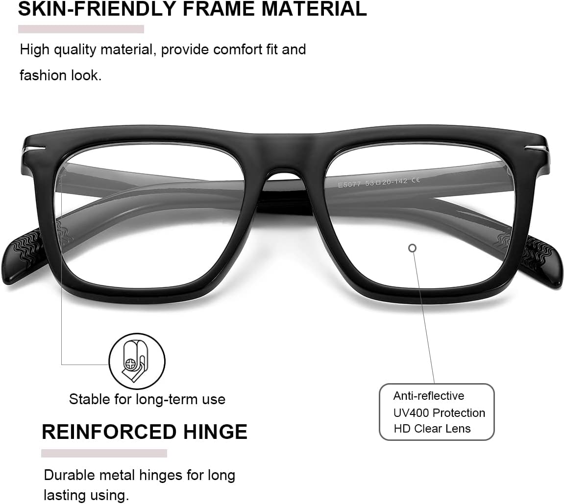 - ★ PREMIUM MATERIAL – Scratch-resistant polycarbonate lens, strong thick yet lightweight plastic frame, one piece anti-skid nose pad, durable stainless steel hinges, unique anti-slip glasses temple, these square glasses frames are very sturdy and comfortable.